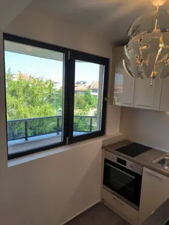 Апартамент с практично оборудвана всекидневна, с кът за хранене и кът за релакс пред телевизора с разтегателен диван, модерна и изцяло оборудвана кухня и голяма тераса по протежението на стаята.